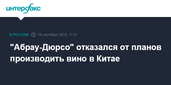 Москва. 19 сентября. INTERFAX.RU - Крупнейший российский производитель игристого вина "Абрау-Дюрсо" отказался от идеи производства в Китае, но будет развивать экспорт в эту страну. В целом в 2019 году компания планирует экспортировать более 1 млн бутылок вина.