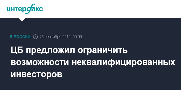 Москва. 23 сентября. INTERFAX.RU - Банк России подготовил новую редакцию законопроекта о квалификации инвесторов, в котором сократил число категорий инвесторов с четырех до трех: особо защищаемый неквалифицированный инвестор, простой неквалифицированный инвестор и квалифицированный инвестор, пишут "Коммерсантъ" и РБК. Опрошенные "Коммерсантом" участники рынка говорят, ЦБ по сути предлагает ограничить возможности до 90% инвесторов.