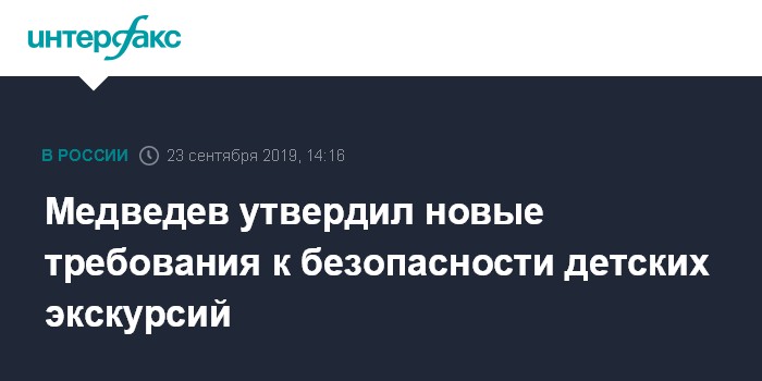 Москва. 23 сентября. INTERFAX.RU - Премьер-министр РФ Дмитрий Медведев сообщил об утверждении новых требований к организации детских экскурсионных поездок на автобусах, в соответствии с которыми все дети должны быть пристегнуты ремнями безопасности.