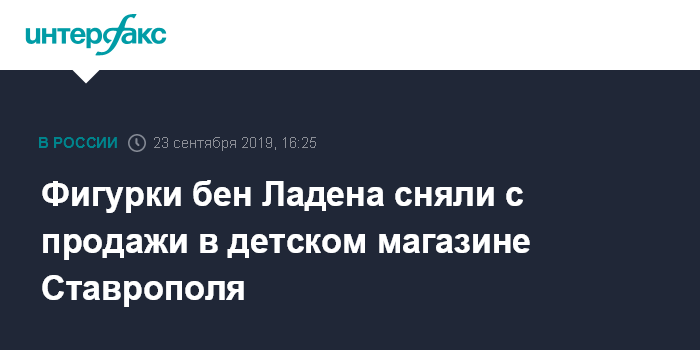 Москва. 23 сентября. INTERFAX.RU - Детский магазин в Ставрополе перестал торговать фигурками лидера "Аль-Каиды" (запрещенная в России террористическая организация) Усамы бен Ладена.