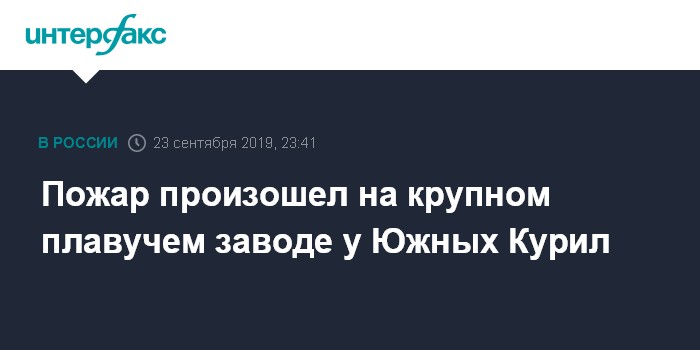 Москва. 23 сентября. INTERFAX.RU - У побережья южнокурильского острова Шикотан загорелся консервный цех на плавучем заводе "Петр Житников", сообщил "Интерфаксу" информированный источник.