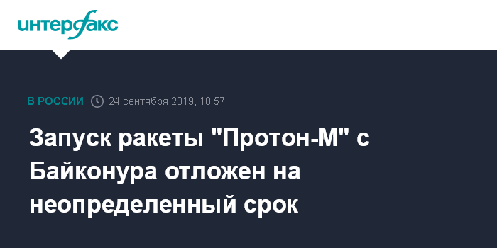 Москва. 24 сентября. INTERFAX.RU - Запуск ракеты-носителя "Протон-М" со спутником связи Eutelsat отложен, сообщили "Интерфаксу" в пресс-службе Роскосмоса.