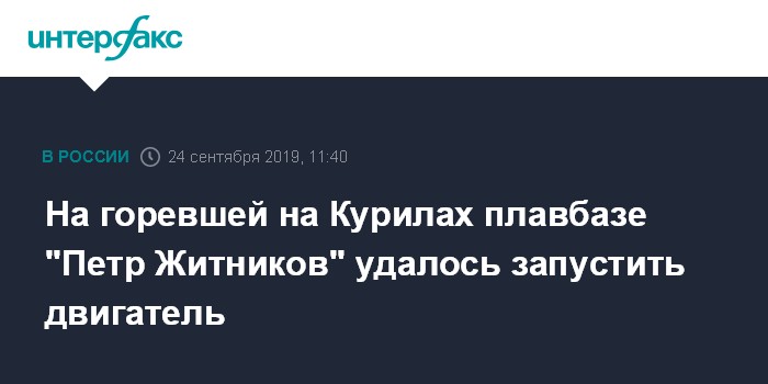 Москва. 24 сентября. INTERFAX.RU - Аварийной команде удалось запустить двигатель горящей плавбазы "Петр Житников", взять управление на резервном пункте на корме и направить судно к Итурупу, сообщили в пресс-службе Росморречфлота.