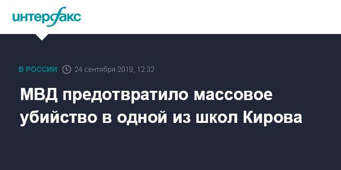 Москва. 24 сентября. INTERFAX.RU - Сотрудники правоохранительных органов в сентябре 2019 года пресекли массовое убийство с использованием взрывчатки и холодного оружия в одной из школ Кирова, сообщил заместитель начальника антиэкстремистского главка МВД РФ Владимир Макаров.