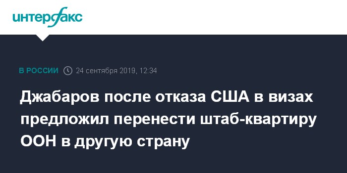 Москва. 24 сентября. INTERFAX.RU - Первый замглавы комитета по международным делам Совета Федерации Владимир Джабаров предложил обсудить вопрос о переносе штаб-квартиры ООН из США в другую страну после того, как американская сторона не выдала визы членам российской делегации для участия в мероприятиях Генассамблеи ООН в Нью-Йорке.