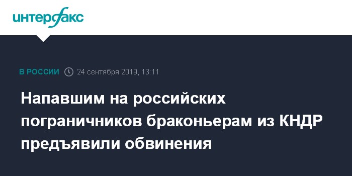 Москва. 24 сентября. INTERFAX.RU - Северокорейским браконьерам, которые напали на российских пограничников в Японском море, предъявлено обвинение, сообщил телеканал "Россия 24".
