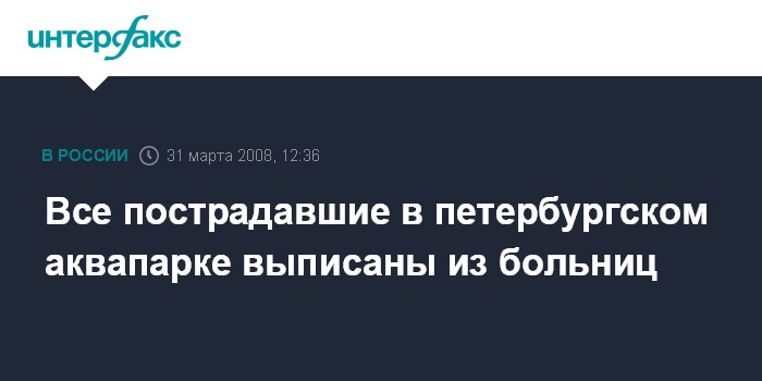 Санкт-Петербург. 31 марта. INTERFAX.RU - Все госпитализированные с отравлением посетители аквапарка "Вотервиль " в Петербурге выписаны из больниц города, сообщили "Интерфаксу" в службе информации городской станции скорой помощи.