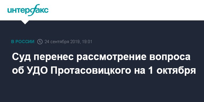 Москва. 24 сентября. INTERFAX.RU - Судья Клинцовского городского суда Брянской области во вторник перенес рассмотрение ходатайства об условно-досрочном освобождении (УДО) Александра Протасовицкого, осужденного по делу о драках в Москве.