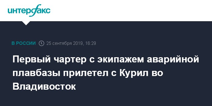 Москва. 25 сентября. INTERFAX.RU - Чартерный рейс с первой группой моряков, эвакуированных с горящей в Тихом океане плавбазы "Петр Житников", прибыл в среду во Владивосток, следует из данных онлайн-табло аэропорта Владивосток.