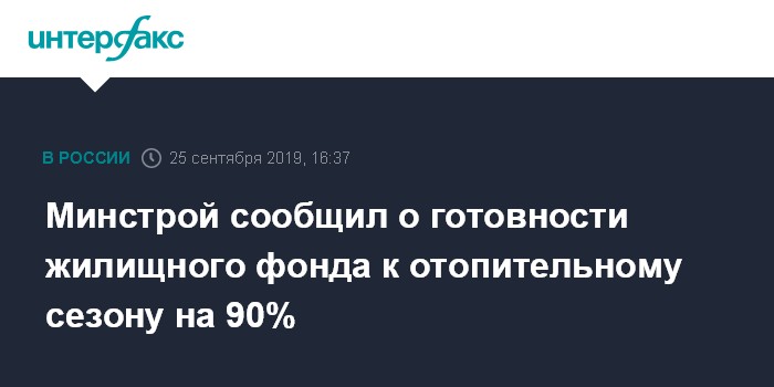 Москва. 25 сентября. INTERFAX.RU - Жилищный фонд России по данным на 1 сентября готов к проведению отопительного сезона на 90%, сообщил в среду глава Минстроя РФ Владимир Якушев.