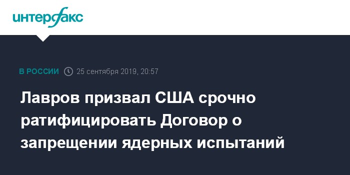 Москва. 25 сентября. INTERFAX.RU - Россия призывает США пересмотреть свое решение и ратифицировать Договор о всеобъемлющем запрещении ядерных испытаний (ДВЗЯИ), заявил глава МИД РФ Сергей Лавров.