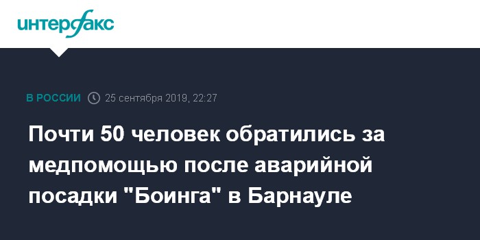 Москва. 25 сентября. INTERFAX.RU - После возгорания шасси самолета, приземлившегося в Барнауле, к медикам обратились почти 50 человек, сообщил "Интерфаксу" информированный источник в среду вечером.