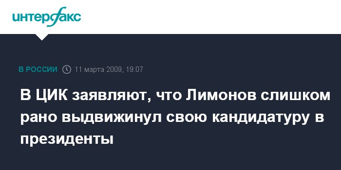 Москва. 11 марта. INTERFAX.RU - ЦИК РФ рекомендует оппозиционному политику Эдуарду Лимонову дождаться установленных законом сроков для выдвижения своей кандидатуры на участие в президентских выборах 2012 г., сообщил представитель пресс-службы Центризбиркома.