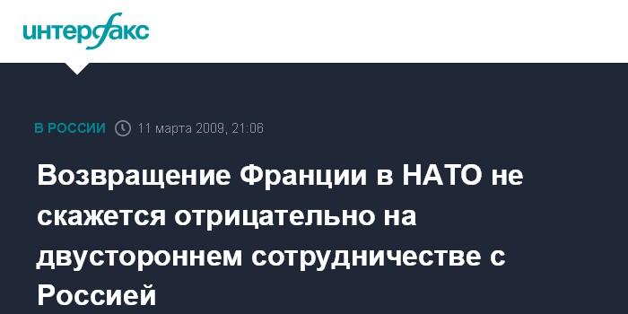 Москва. 11 марта. INTERFAX.RU - Возвращение Франции в военные структуры НАТО не скажется отрицательно на двустороннем сотрудничестве с Россией в военной и военно-технической областях, заявил "Интерфаксу" в среду высокопоставленный военно-дипломатический источник в Москве.