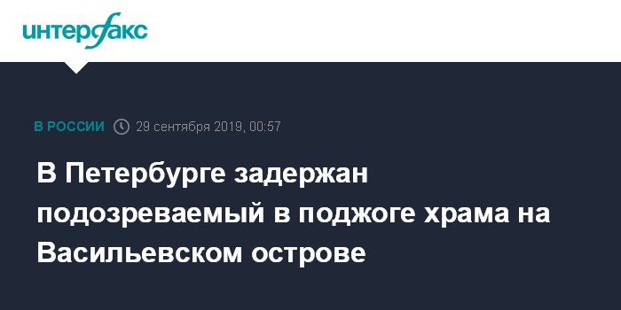 Москва. 29 сентября. INTERFAX.RU - Сотрудники полиции задержали подозреваемого в поджоге храма на Васильевском острове в Санкт-Петербурге, сообщила официальный представитель МВД России Ирина Волк.