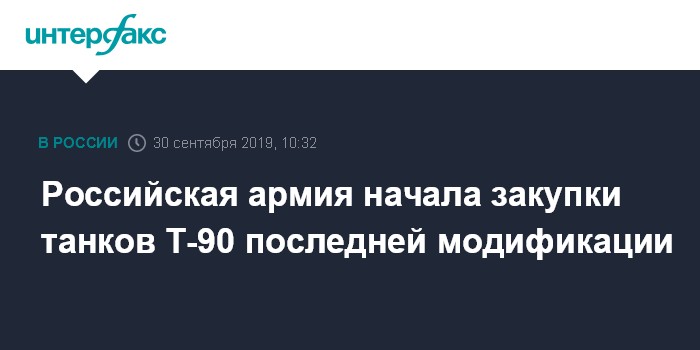 Москва. 30 сентября. INTERFAX.RU - Российская армия начала закупать модернизированные танки Т-90М "Прорыв-3", сообщил главком Сухопутных войск РФ Олег Салюков.