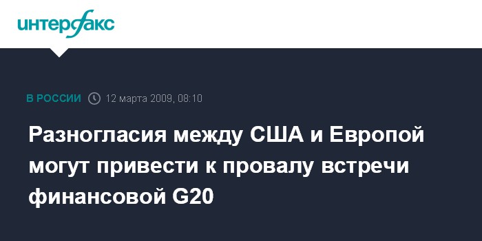 Москва. 12 марта. INTERFAX.RU - Расхождение позиций США и Европы относительно дальнейших действий по борьбе с кризисом может привести к фактическому провалу встречи министров финансов стран "группы двадцати" (G20), которая пройдет 13-14 марта в предместье Лондона.