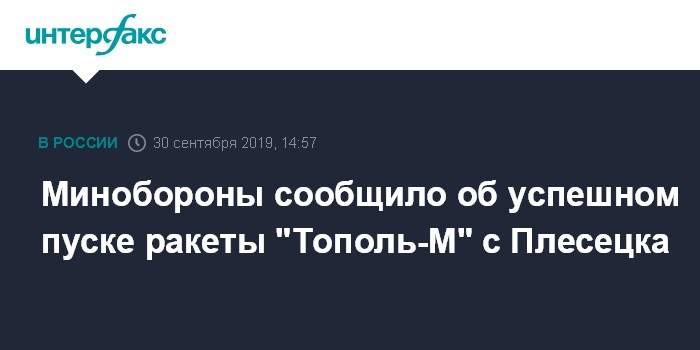 Москва. 30 сентября. INTERFAX.RU - Российские военные в понедельник провели с испытательного космодрома Плесецк в Архангельской области учебно-боевой пуск межконтинентальной баллистической ракеты (МБР) "Тополь-М" шахтного базирования.