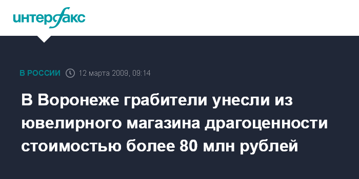Москва. 12 марта. INTERFAX.RU - В Железнодорожном районе Воронежа ограблен ювелирный магазин, сообщил "Интерфаксу" источник в правоохранительных органах.