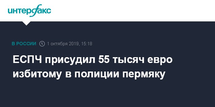 Москва. 1 октября. INTERFAX.RU - Европейский суд по правам человека (ЕСПЧ) присудил 55 тысяч евро компенсации Алексею Пастухову из Перми, который стал инвалидом первой группы, после того, как в феврале 2011 года его пытали в полиции. Об этом сообщили в фонде "Общественный вердикт", юристы которого с 2013 года представляют интересы пострадавшего.