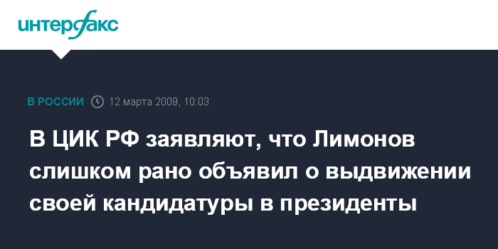 Москва. 12 марта. INTERFAX.RU - ЦИК РФ рекомендует оппозиционному политику Эдуарду Лимонову дождаться установленных законом сроков для выдвижения своей кандидатуры на участие в президентских выборах 2012 года, сообщил представитель пресс-службы Центризбиркома.