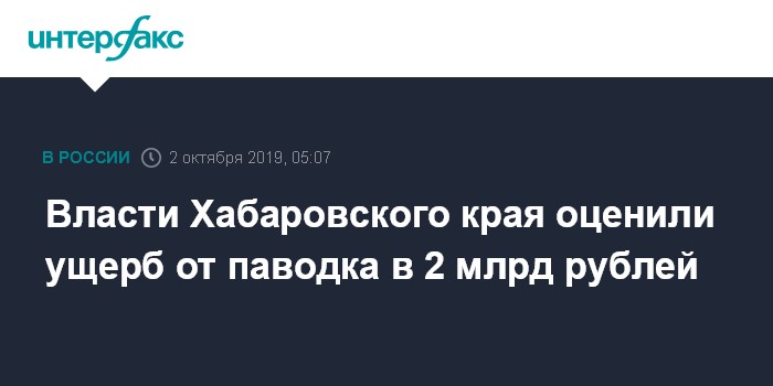 Москва. 2 октября. INTERFAX.RU - Ущерб от паводка в Хабаровском крае, по предварительным подсчетам, составил около 2 млрд рублей, сообщил журналистам зампредседателя правительства региона по вопросам ТЭК и ЖКХ Анатолий Литвинчук.
