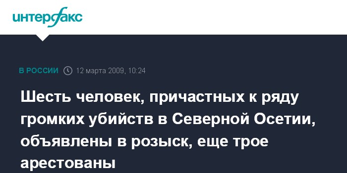 Москва. 12 марта. INTERFAX.RU - К громким убийствам на Северном Кавказе, в том числе убийству мэра Владикавказа Виталия Караева, его предшественника на этом посту Казбека Пагиева, а также начальника отдела уголовного розыска МВД Северной Осетии Виталия Чельдиева, причастна группа из девяти человек, трое из которых арестованы, еще шестеро объявлены в международный розыск.