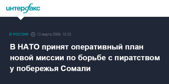 Москва. 12 марта. INTERFAX.RU - Страны-члены НАТО одобрили оперативный план второй миссии по противодействию пиратам у побережья Африканского рога, говорится в заявлении альянса, опубликованном в среду.