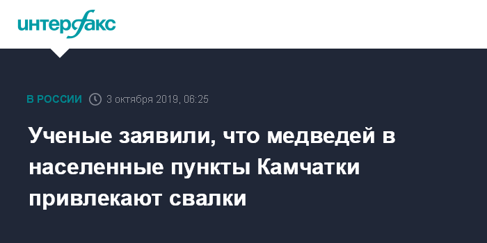 Москва. 3 октября. INTERFAX.RU - Участившиеся выходы медведей в населённые пункты Камчатки связаны с разрастающимися вблизи них свалками, отстреливать этих животных на территории заказника - противозаконно, сообщает пресс-служба ФГБУ "Кроноцкий государственный заповедник".