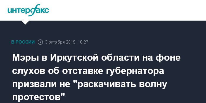 Москва. 3 октября. INTERFAX.RU - Часть мэров городов и районов Иркутской области выступили с открытым письмом, в котором они призвали не "раскачивать волну протестных настроений в регионе" в связи с информацией о возможной отставке губернатора Сергея Левченко.