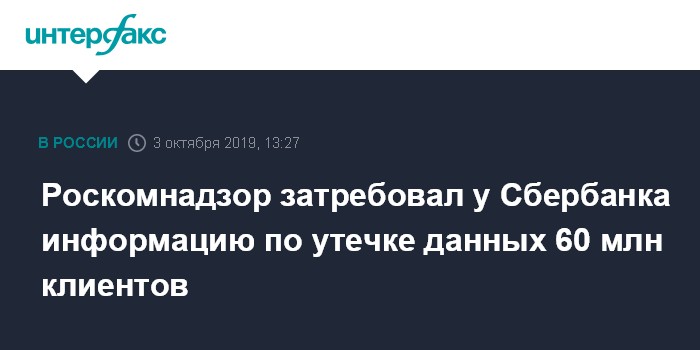 Москва. 3 октября. INTERFAX.RU - Роскомнадзор потребовал от Сбербанка предоставить информацию, касающуюся возможной утечки персональных данных 60 млн клиентов кредитного учреждения, сообщили в пресс-службе ведомства.