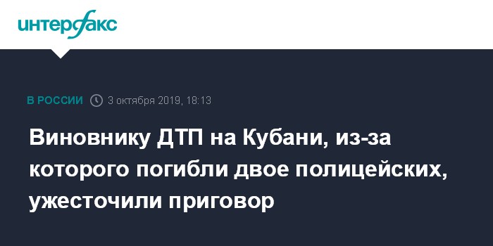 Москва. 3 октября. INTERFAX.RU - Краснодарский краевой суд увеличил срок заключения с пяти до семи лет виновнику дорожной аварии, жертвами которой стали двое сотрудников полиции, сообщили "Интерфаксу" в пресс-службе суда в четверг.
