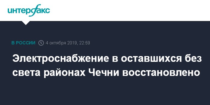 Москва. 4 октября. INTERFAX.RU - Электрики восстановили электроснабжение в Ачхой-Мартановском и Сунженском районах Чечни, сообщает Минэнерго РФ.