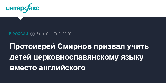 Москва. 6 октября. INTERFAX.RU - Председатель патриаршей комиссии по делам семьи протоиерей Димитрий Смирнов предложил обучать детей церковнославянскому языку вместо английского.