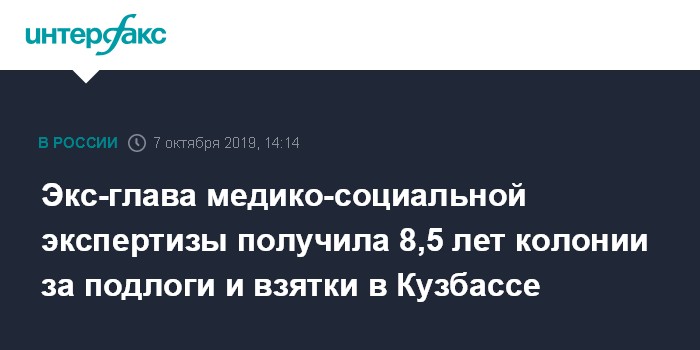 Москва. 7 октября. INTERFAX.RU - Суд Центрального района Прокопьевска (Кузбасс) признал виновной в получении взяток и служебных подлогах экс-руководителя Главного бюро медико-социальной экспертизы по Кемеровской области Минтруда РФ, сообщили "Интерфаксу" в пресс-службе областной прокуратуры в понедельник.