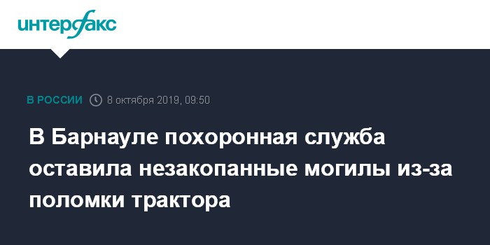 Москва. 8 октября. INTERFAX.RU - На Власихинском сельском кладбище в Барнауле со 2 по 7 октября похоронили девять человек, но их могилы остались незакопанными, так как сломался трактор. Об этом сообщили в пресс-службе мэрии Барнаула.
