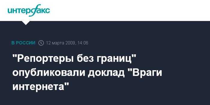 Москва. 12 марта. INTERFAX.RU - Доклад, названный "Враги интернета" опубликован в четверг международной журналистской организацией "Репортеры без границ" в рамках объявленной ими акции, приуроченной ко Всемирному дню против цензуры в интернете.