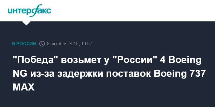 Москва. 8 октября. INTERFAX.RU - Авиакомпания "Победа" на фоне задержки поставок Boeing 737 MAX заберет у "России" четыре новых самолета предыдущего поколения Boeing 737 Next Generation. Об этом сообщил "Интерфаксу" источник в группе "Аэрофлот".