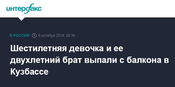 Москва. 9 октября. INTERFAX.RU - Шестилетняя девочка и ее двухлетний брат в кузбасском Киселевске выпали с балкона четвертого этажа, правоохранительные органы начали проверку, сообщает пресс-служба управления Следственного комитета РФ (СКР) по региону в среду.