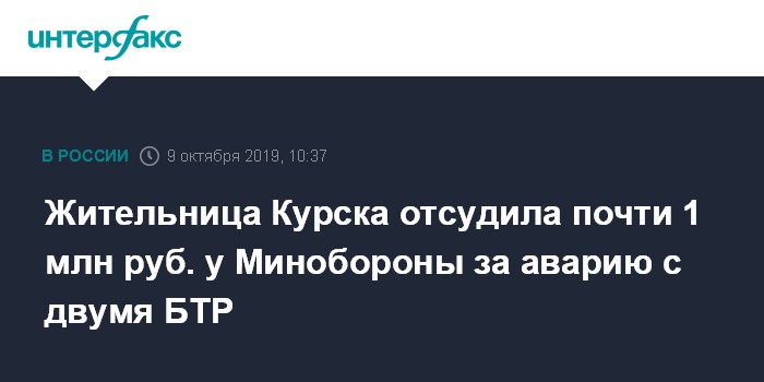 Москва. 9 октября. INTERFAX.RU - Ленинский суд Курска удовлетворил иск местной жительницы о взыскании с Минобороны РФ компенсации в размере 912,8 тыс. рублей за поврежденный в аварии с участием двух бронетранспортеров (БТР) автомобиль, сообщает пресс-служба суда.