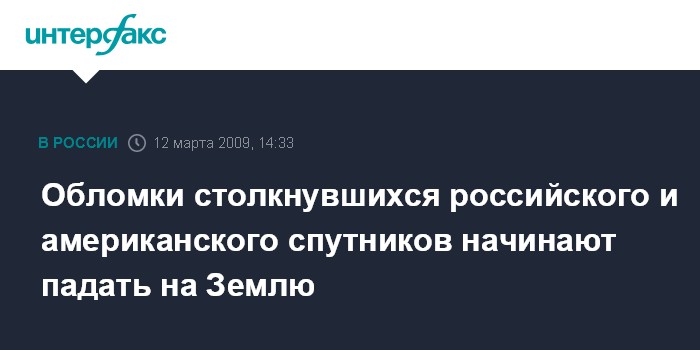 Москва. 12 марта. INTERFAX.RU - Первые обломки столкнувшихся в начале февраля российского и американского спутников "Космос-2251" и Iridium в ближайшее время начнут входить в атмосферу Земли.