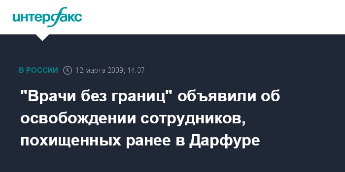 Москва. 12 марта. INTERFAX.RU - Пять сотрудников, являющихся сотрудниками бельгийского представительства организации "Врачи без границ" (ВБЗ), освобождены в четверг в суданской провинции Дарфур после того, как провели несколько часов в плену, сообщают представители этой организации.
