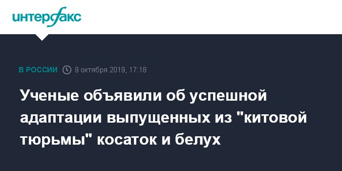 Москва. 9 октября. INTERFAX.RU - Все косатки и белухи, выпущенные из бухты Средняя Приморского края в Охотское море, успешно прошли адаптациию и находятся в пределах традиционных видовых ареалов, утверждают во Всероссийском научно-исследовательском институте рыбного хозяйства и океанографии (ВНИРО) в среду.