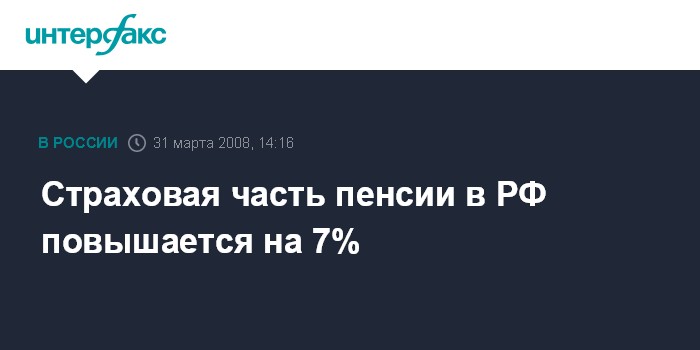 Ново-Огарево. 31 марта. INTERFAX.RU - Cтраховая часть пенсии в России с 1 апреля будет повышена на 7%, сообщила на совещании у президента глава Минздравсоцразвития Татьяна Голикова, добавив, что это уже вторая в текущем году индексация пенсий.