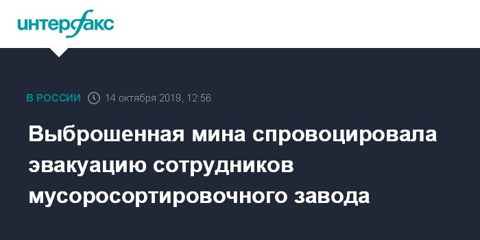 Москва. 14 октября. INTERFAX.RU - В Тюмени на мусоросортировочном заводе провели эвакуацию 180 человек, так как в мусоре нашли опасный предмет. Вызванные сотрудники спецслужб определили, что это была учебная мина, сообщили в пресс-службе ООО "Тюменское экологическое объединение" ("ТЭО", региональный оператор по обработке твердых отходов).