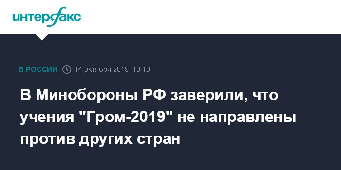 Москва. 14 октября. INTERFAX.RU - Учения стратегических ядерных сил (СЯС) "Гром-2019" носят оборонительный характер и не направлены против отдельных государств или коалиций стран, заявил врио начальника Главного управления международного военного сотрудничества Минобороны РФ генерал-майор Евгений Ильин.