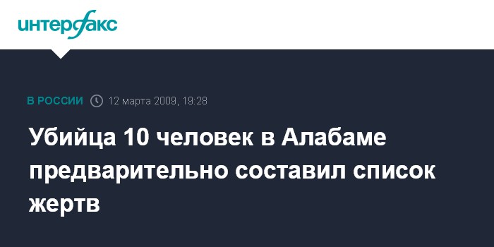 Лондон. 12 марта. INTERFAX.RU - Мужчина, застреливший в американском штате Алабама 10 человек, а затем покончивший с собой, предварительно составил список своих потенциальных жертв, сообщает BBC со ссылкой на заявление представителей полиции штата.
