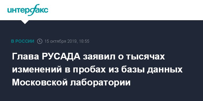 Москва. 15 октября. INTERFAX.RU - Генеральный директор Российского антидопингового агентства Юрий Ганус заявил о тысячах изменений, которые были внесены в базу данных Московской антидопинговой лаборатории, переданной экспертам Всемирного антидопингового агентства (ВАДА).