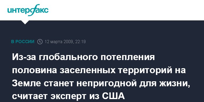Лондон. 12 марта. ИНТЕРФАКС - Глобальное потепление может сделать половину всех заселенных территорий в мире непригодными для жизни, цитирует в четверг британская газета "Гардиан" заявление эксперта по изменению климата Йельского университета (США) Стивена Шервуда.