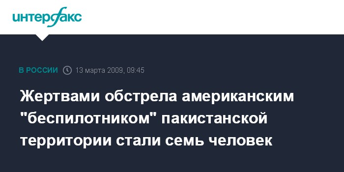Москва. 13 марта. INTERFAX.RU - По меньшей мере, семь человек погибли в результате ракетного удара, нанесенного, вероятно, американским беспилотным самолетом по территории пакистанского района Куррам в четверг, сообщают индийские СМИ.